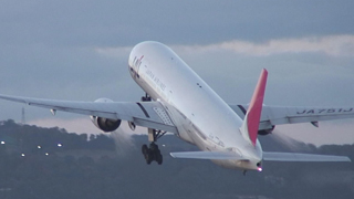 撮り方ですが、ANAのB777は離陸直前に若干ズームバック、JALのB777はアップのまま機体をフォローしています。離陸時に機首から機体後部にかけてアップでカメラを動かしている(カメラをパンするスピードをやや落とすと、機体が前に移動していく)ので、離陸する巨大な機体の豪快さが結構うまく表現できたと思います。