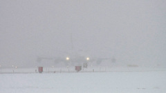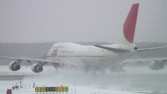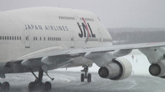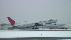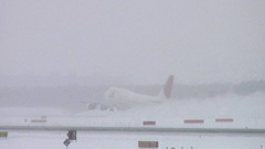 遠くは白一色で、その中から飛行機が徐々に現れます。いやあ、晴れているのもいいですが、吹雪いているのもこれぞ北海道という感じでとてもよいですね。
