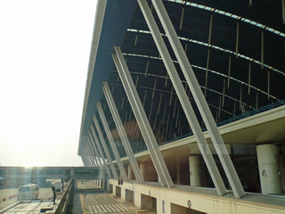 ターミナルビルの内部です。とてもきれいで明るく、開放的な空間です。構造的には屋根を吊っているのでしょうか?