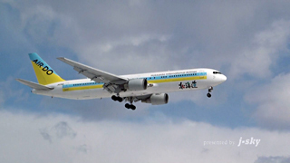 2009年2月の新千歳遠征の第2弾は、晴天のランディング・シーンです。撮影場所は、ランウェイ19Lエンドおよび生コンポイントです。ランウェイ19Lエンドのフェンス際は立ち入り禁止で近付けなくなりましたが、天気がよいと、雪の野原が天然のレフ板になって飛行機の下面を照らし、とても美しいシーンが展開します。