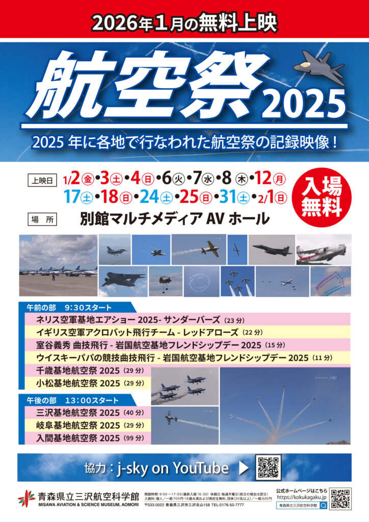 2025年12月25日 / 最終更新日 : 2025年12月28日 Takashi Hoshizawa Topics of my works 三沢航空科学館でj-skyの航空祭の動画を上映 2026年1月、三沢航空科学館で当チャンネルの航空祭の動画を上映していただけることになりました。 三沢航空科学館のホームページ: https://kokukagaku.jp/event/10425/ FacebooktwitterHatenaPocket コメントを残す コメントをキャンセル メールアドレスが公開されることはありません。 * が付いている欄は必須項目ですコメント 名前 * メール * サイト 次回のコメントで使用するためブラウザーに自分の名前、メールアドレス、サイトを保存する。 キャプチャコード* (上の4桁の英数字を入力して下さい) このサイトはスパムを低減するために Akismet を使っています。コメントデータの処理方法の詳細はこちらをご覧ください。