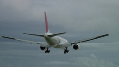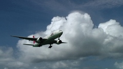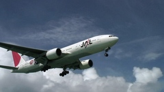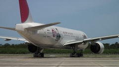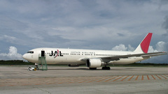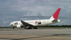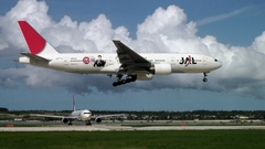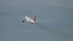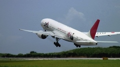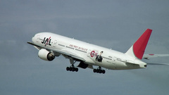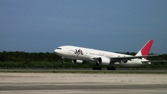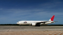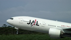 ちょうど撮影している私の目の前を、轟音とともに離陸していくJALのB777。よく見ると、片方のエンジンだけで離陸していますね。