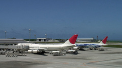 下地島では晴れかつ南風の日が3日間あり、「これぞ下地島」というようなショットをビデオに収めることができました。訓練機に関しては、JALのB777、B767、ANAのA320は予定通りだったのですが、予期していなかったA-netのDHC-8やGalaxy AirlinesのA300が加わって、思いのほか賑やかなものとなりました。北風の日はありませんでしたが、下地島空港のエプロン内での撮影許可をいただけたおかげで、シーンのバリエーションもかなり増やすことができました。那覇空港での撮影も、初日はNGだったものの、最終日に晴れてくれたおかげで、なんとか成果を得ることができました。6日間の遠征で、撮影したビデオテープは60分テープ19本になりました。