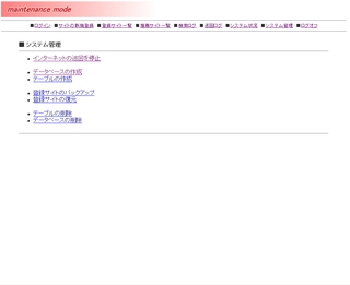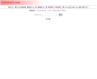 パスワード(設定ファイルの「password =」で指定したもの)を入力し、「実行」をクリックすると、管理者モードに入ります。上部のメニューから、「システム管理」をクリックします。